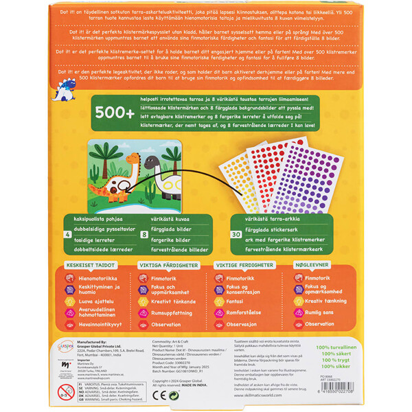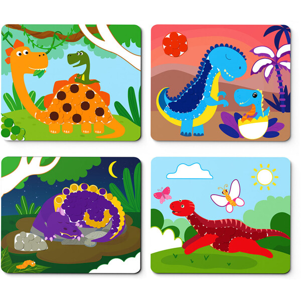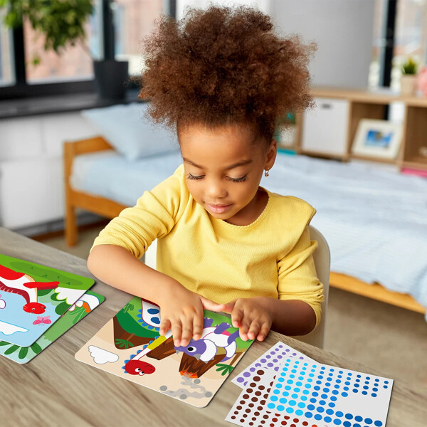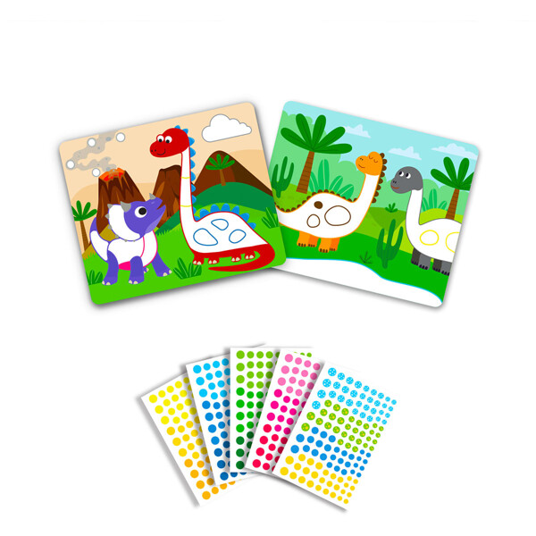 Yli 500 pyöreän tarran eri kokoisina ja värisinä avulla lapsi voi käyttää mielikuvitustaan värittääkseen mukana tulevat kuvakortit. Teemana on jännittävät dinosaurukset. Kehittää hienomotoriikkaa, pinsettiotetta, luovaa ja avaruudellista ajattelua, silmä-käsi koordinaatiota ja keskittymistä.
