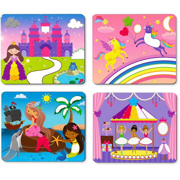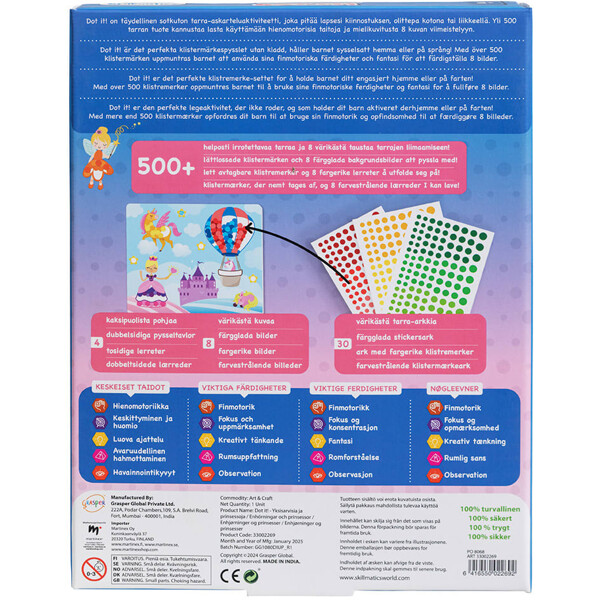 Yli 500 pyöreän tarran eri kokoisina ja värisinä avulla lapsi voi käyttää mielikuvitustaan värittääkseen mukana tulevat kuvakortit. Teemana ovat maagiset yksisarviset ja prinsessat. Kehittää hienomotoriikkaa, pinsettiotetta, luovaa ja avaruudellista ajattelua, silmä-käsi-koordinaatiota ja keskittymistä.
