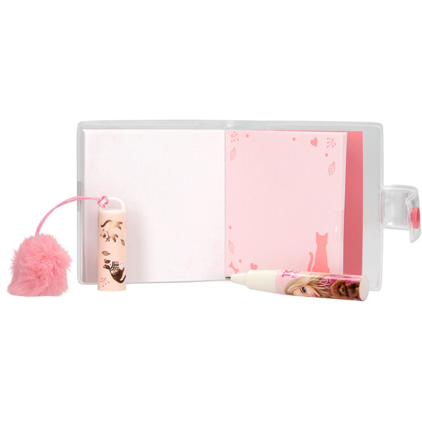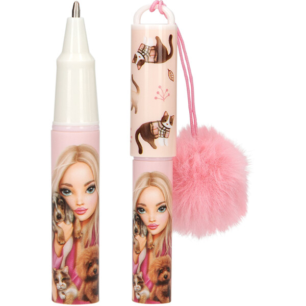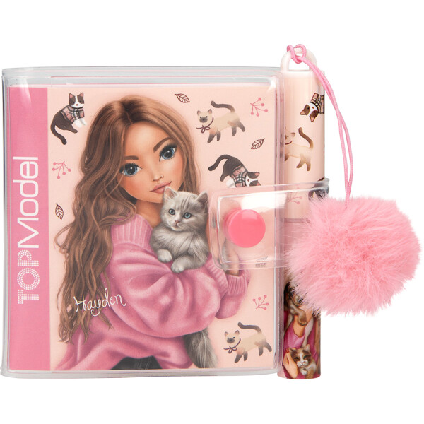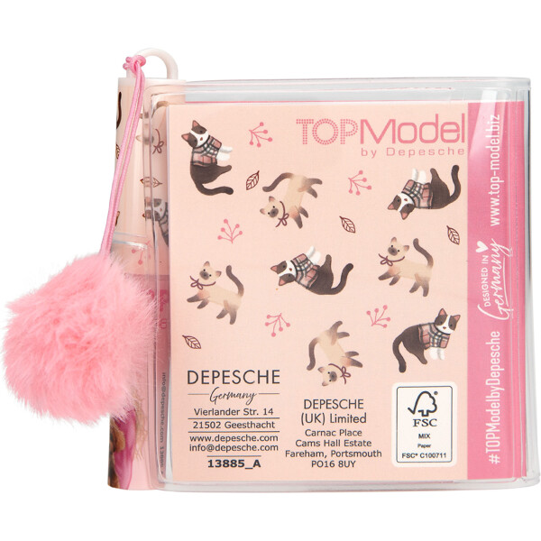 Pieni muistikirja kynällä ja söpöllä pehmeällä pompomhärällä TOPModel Fur Ever Friends -sarjasta, jossa on TOPModel Hayden kannessa ja Candy kynän kuviona, ympäröitynä suloisilla koirilla ja kissoilla.