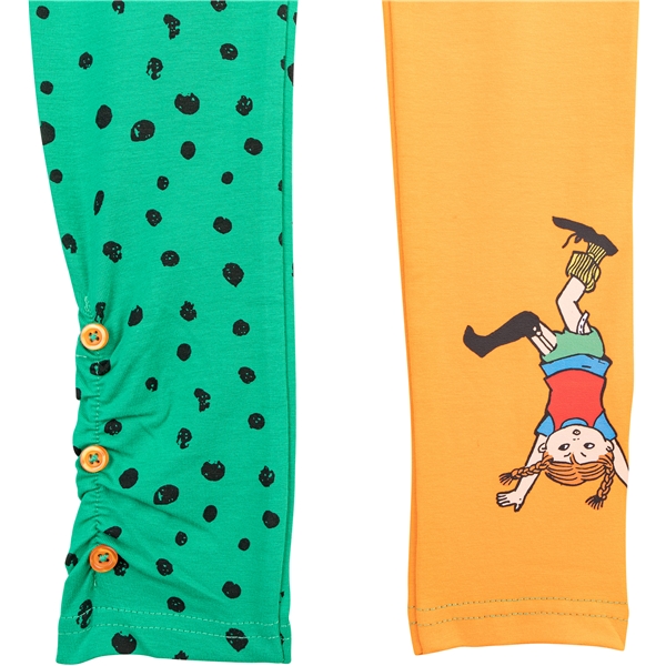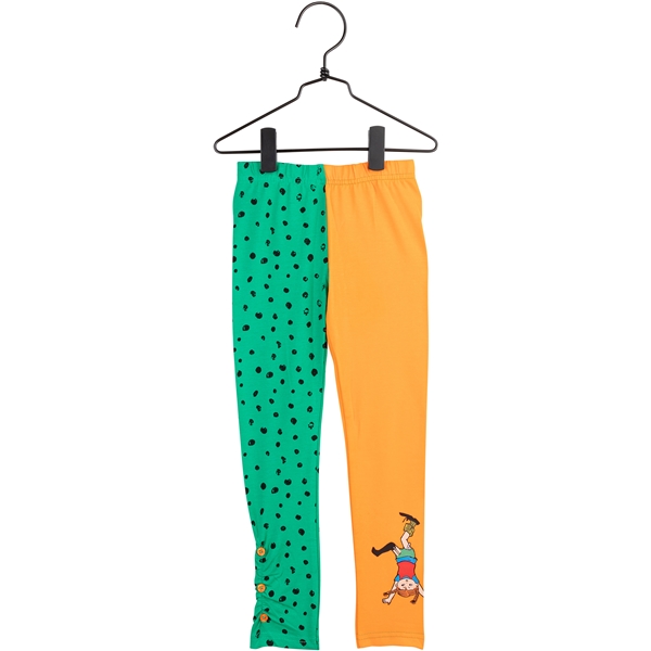 Peppi Pilkku Leggingsit Vihreät ovat leggingsit pehmeästä puuvillasta. Yhdessä sääressä on vihreä pohja mustin pilkuin ja jalan alaosassa on päälle ommellut napit hauskana yksityiskohtana. Toinen sääri on oranssi ja siinä on alaosassa leikkisä kuviointi, jossa Peppi seisoo käsillään.