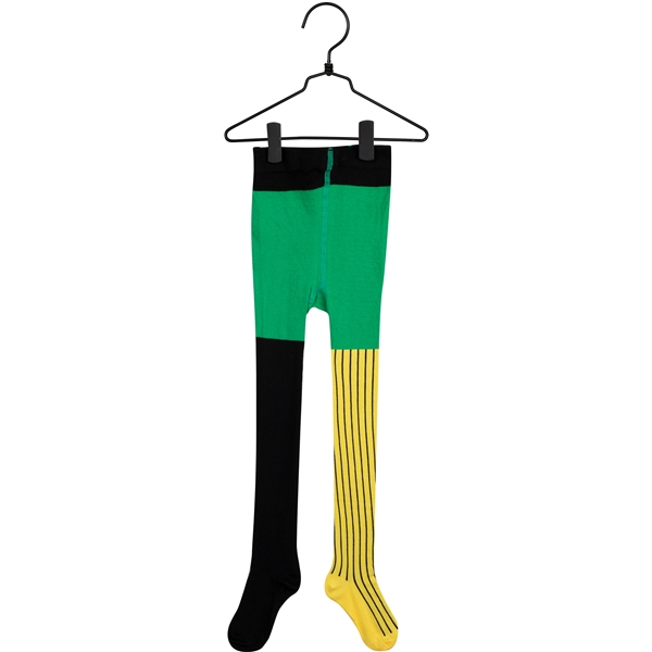 Värikkäät sukkahousut ohuesta ja pehmeästä puuvillasekoiteneuloksesta. Vyötäröllä resori. Värikkäät, vihreä-musta yläosa, yksi keltainen jalka pitkin raidoin ja toinen jalka on musta.