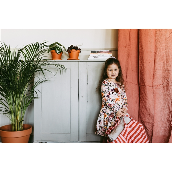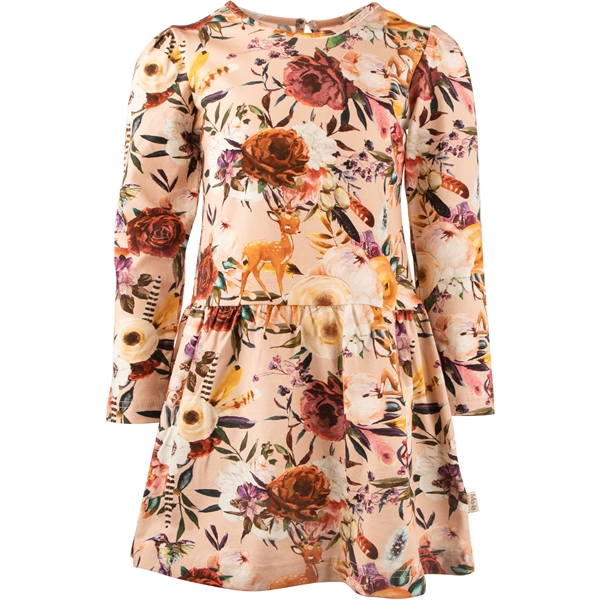 Satumaisen somaa! Kuka voi vastustaa somaa bambia, joka yhdessä ystävänsä kanin kanssa seikkailee satumaisessa kukkaismaisemassa? Tulevatko ystävät saamaan seurakseen kukkien keskellä lentelevät kolibrit? Pitkähihainen mekko puhvihihoin on valmistettu pehmeästä ekologisesta puuvillasekoitteesta. Vyötäröltä leikattu ja kellotettu hameosa sekä avainreikäaukko selässä. Lisäksi se on niin tavattoman soma! Öko-tex.