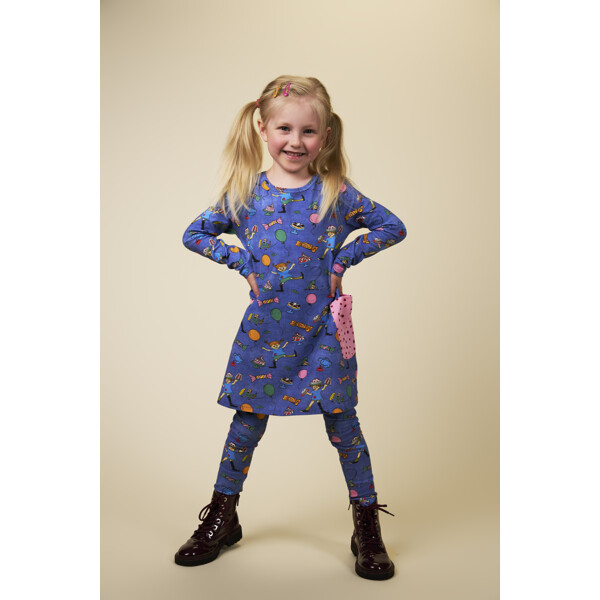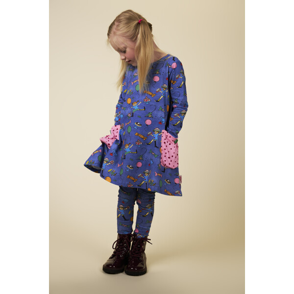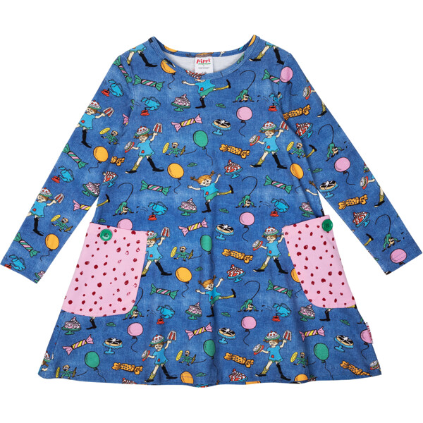 Pehmeä ja mukava Peppi Pitkätossu -mekko lapsille, ihanan deniminsinisenä ja juhlallisella kuviolla. A-linjainen mekko on pitkähihainen, siinä on pyöreä pääntie ja ommellut taskut koristeellisilla napeilla hameosassa. Tuote sisältää sertifioitua luomupuuvillaa.