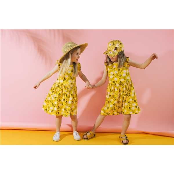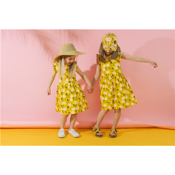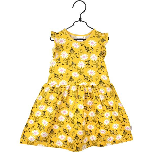 Muumi Kamomilla Mekko Keltainen on hihaton retrohenkinen keltainen mekko, jossa pikku myy on valkoroosan vöristen kamomillakukkien keskellä. Mekossa on rimssut olkapäillä ja se on kellotettu runsaalla helmarypytyksellä. Kaula-aukossa on keltainen kanttaus.