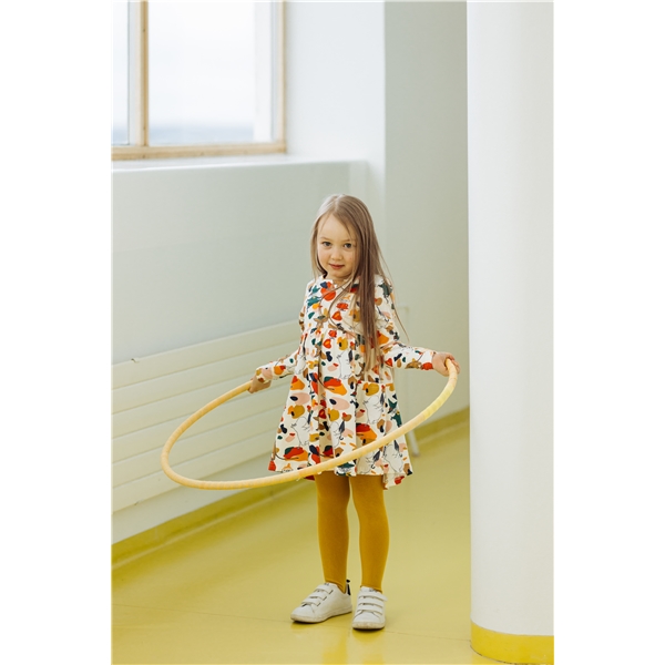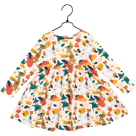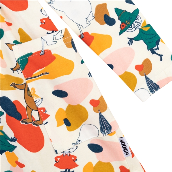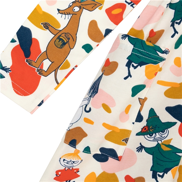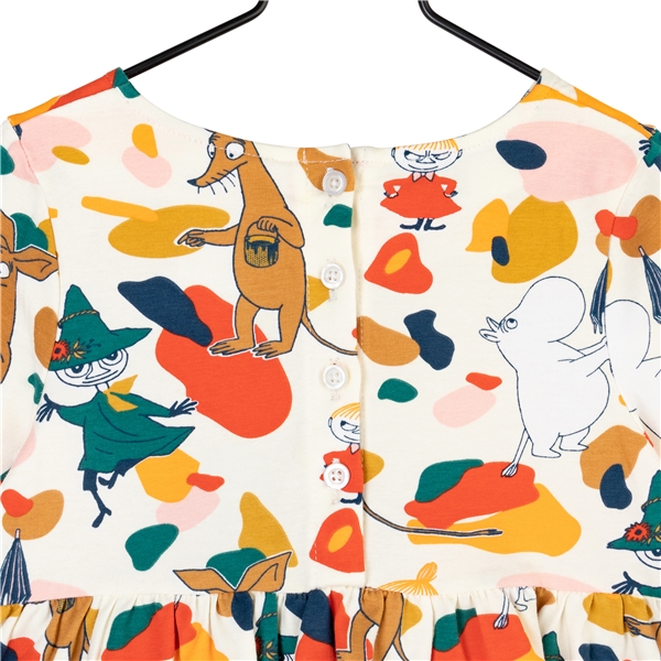 Pitkähihainen, luunvalkoinen mekko, jossa on hauskat Muumi-hahmot värikkäin läiskin. Mekossa on selkänapitus ja hameosa levenevä.
