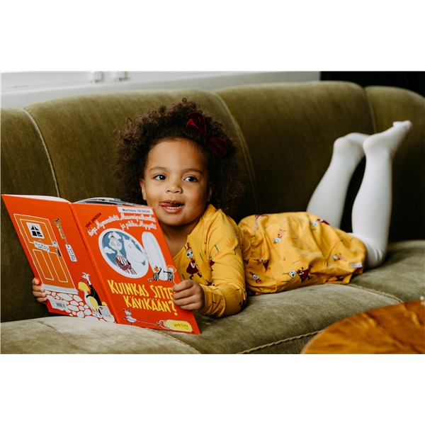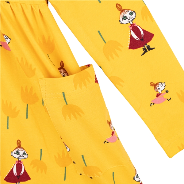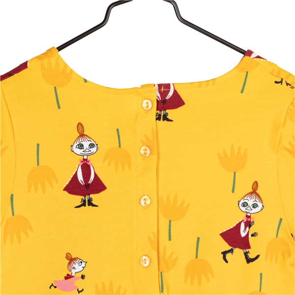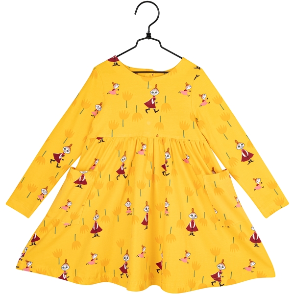 Muumi Tulppaanit Mekko Keltainen on pitkähihainen mekko, jossa Pikku Myy ja Mymmeli ovat isojen tulppaanien keskellä. Mekossa on napit selässä ja edessä päälle ommellut taskut.