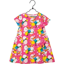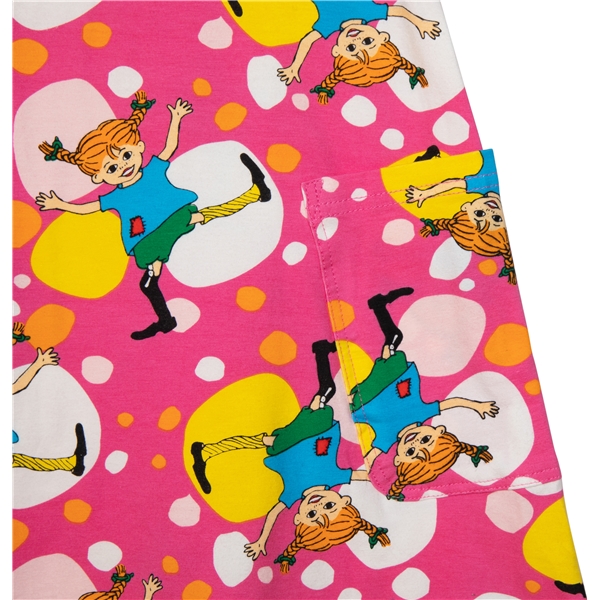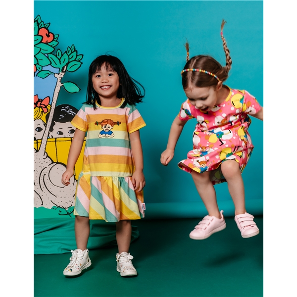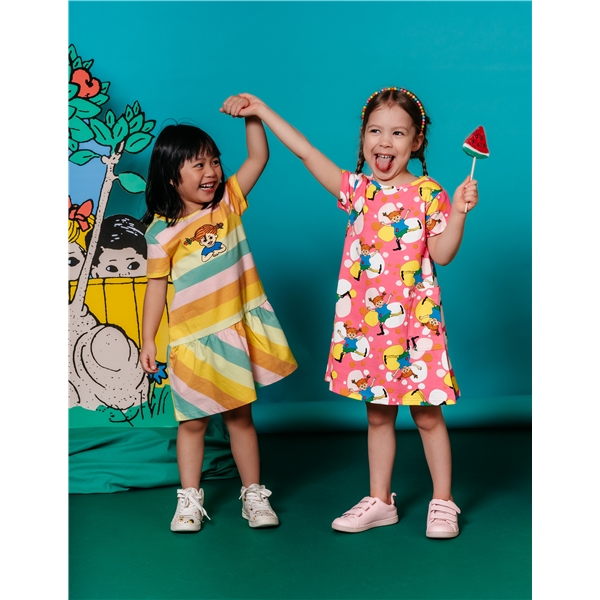 Värikäs Peppi-kesämekko lapsille. A-mallisessa mekossa on lyhyet hihat ja kaksi paikattua taskua helmassa. Mekko on valmistettu GOTS-sertifioidusta orgaanisesta puuvillasekoitteesta.
