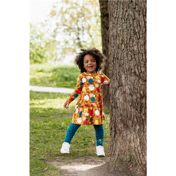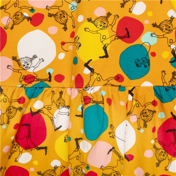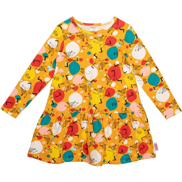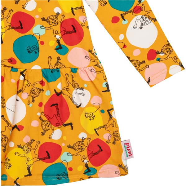 Pitkähihainen hennon oranssin värinen mekko, jonka kokokuvioinnissa Peppi Pitkätossu heittää kärrynpyörää hauskojen väripallojen keskellä. mekko on A-mallinen ja helmassa on kaunis rypytys. Ekologinen puuvillasekoite.