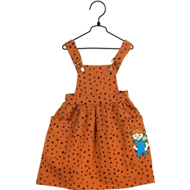 Pehmeä ja mukava henkselimekko sweatshirt-materiaalista harjatulla sisäpuolella. Mekko on mustapilkullinen ja sitä koristaa päälle ommellut taskut edessä. Yhtä taskua koristaa Peppi Pitkätossu -brodeeraus. Vyötärö on joustava ja säädettävät henkselit menevät selässä ristiin, minkä ansiosta ne pysyvät hienosti paikoillaan.