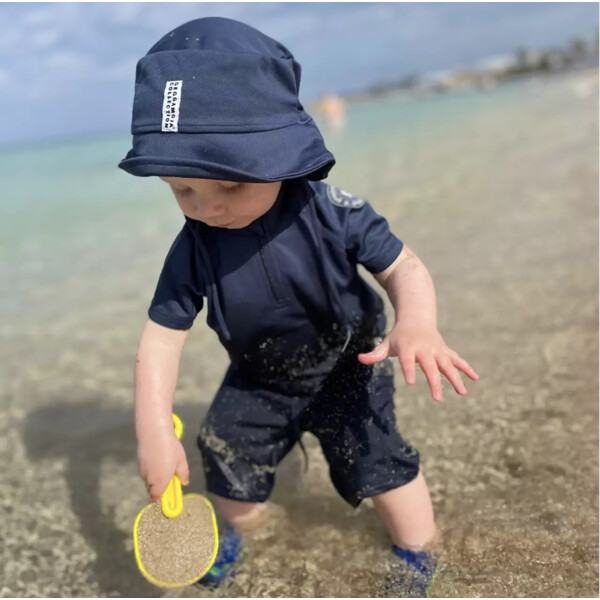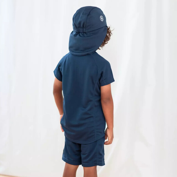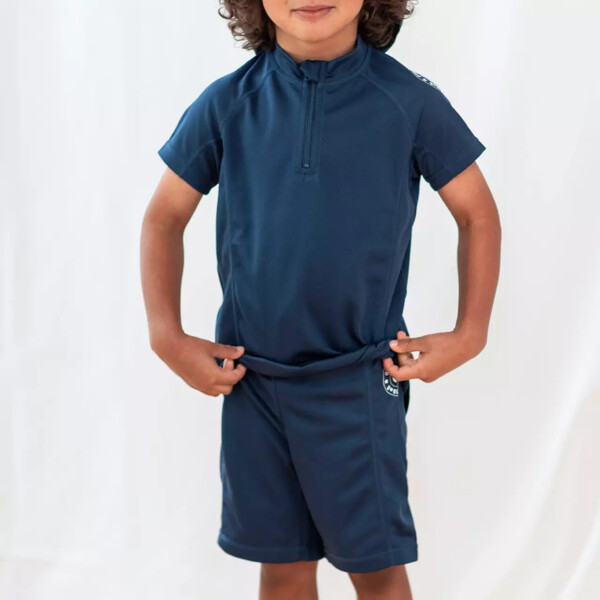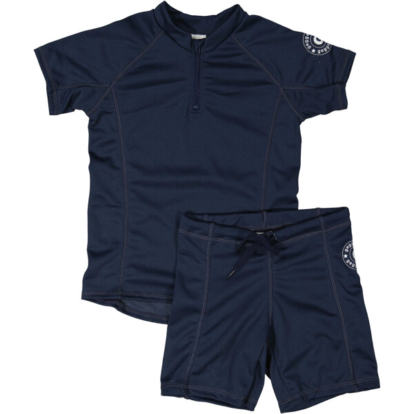Tummansininen UV-uima-asu, jossa on lyhythihainen paita ja shortsit.