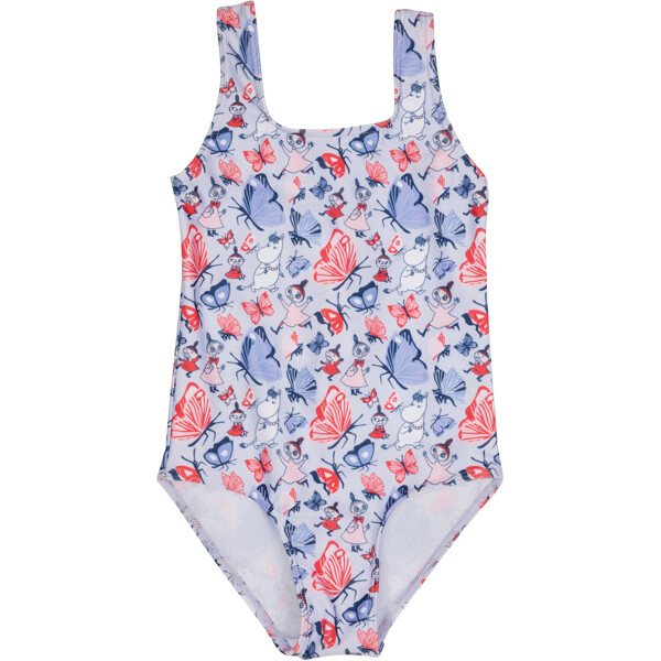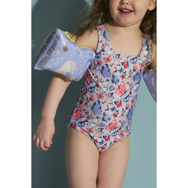 Ihana Muumi-uimapuku lapsille. Uimapuku on vuorattu edestä, korkea selkäosa leveillä ja tukevilla olkaimilla. Valmistettu joustavasta, nopeasti kuivuvasta polyesterisekoituksesta.