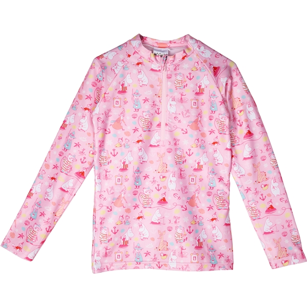 Vaaleanpunainen muumikuviollinen uimapaita lapsille. Uimapaita on pitkähihainen ja siinä on vetoketju ylhäällä.