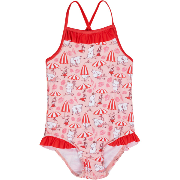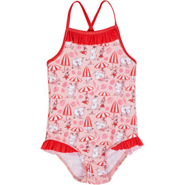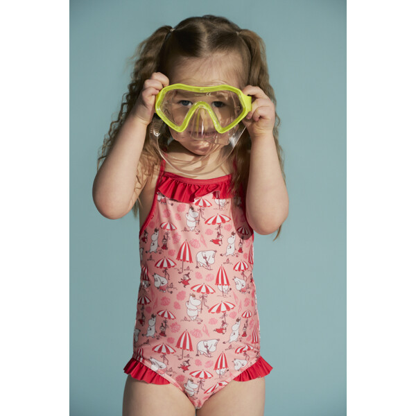 Suloinen Muumi-uimapuku lapsille. Uimapuku on vuorattu edestä ja siinä on ristikkäiset olkaimet sekä pienet röyhelöyksityiskohdat yläreunassa ja jaloissa. Valmistettu joustavasta, nopeasti kuivuvasta polyesterisekoituksesta.