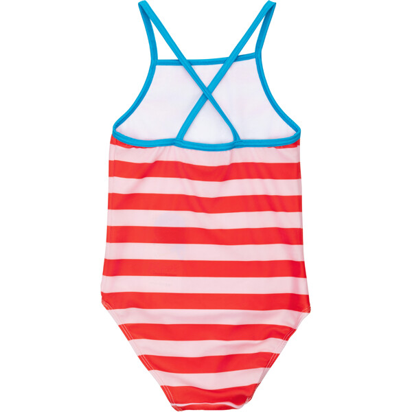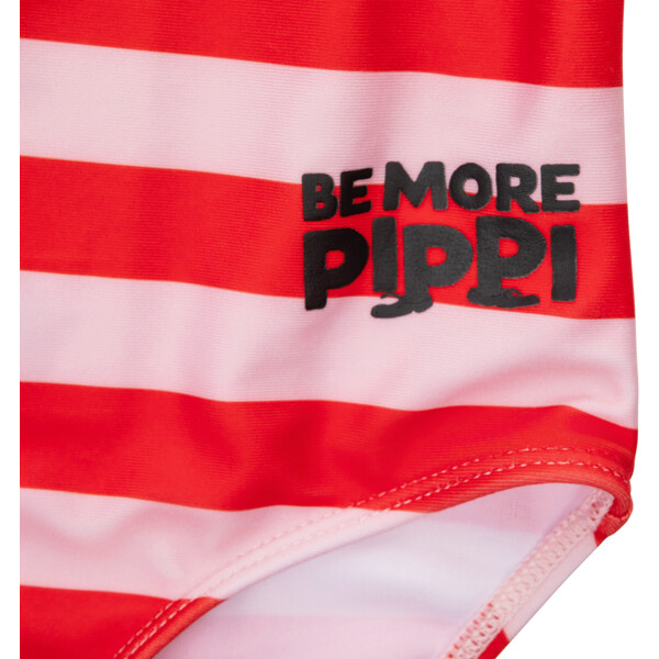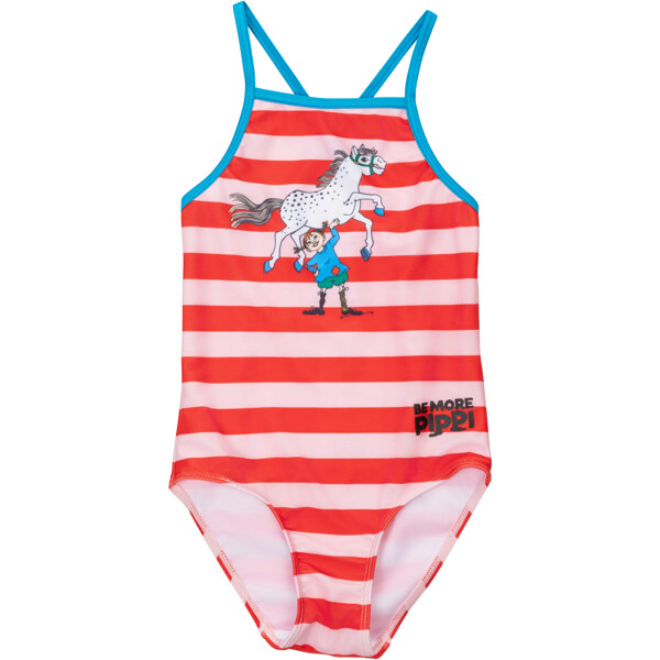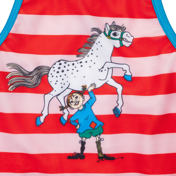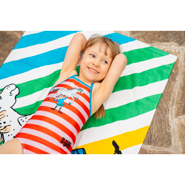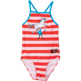 Hauska raidallinen Peppi-uimapuku lapsille. Uimapuku on vuorattu edestä, se on korkea selästä ja ohuet, ristikkäiset olkaimet eivät putoa olkapäiltä. Valmistettu joustavasta, nopeasti kuivuvasta polyesterisekoituksesta.