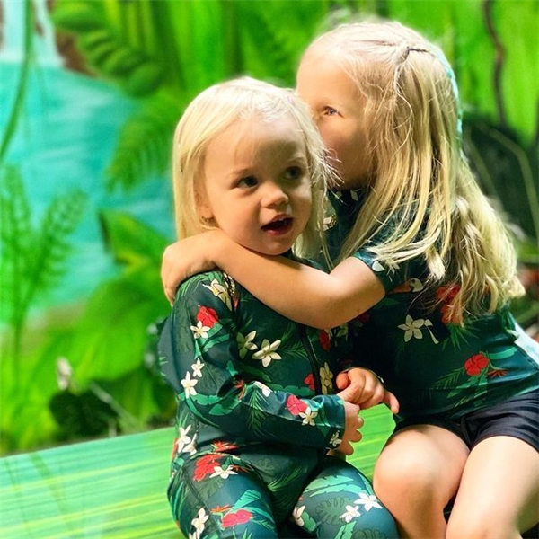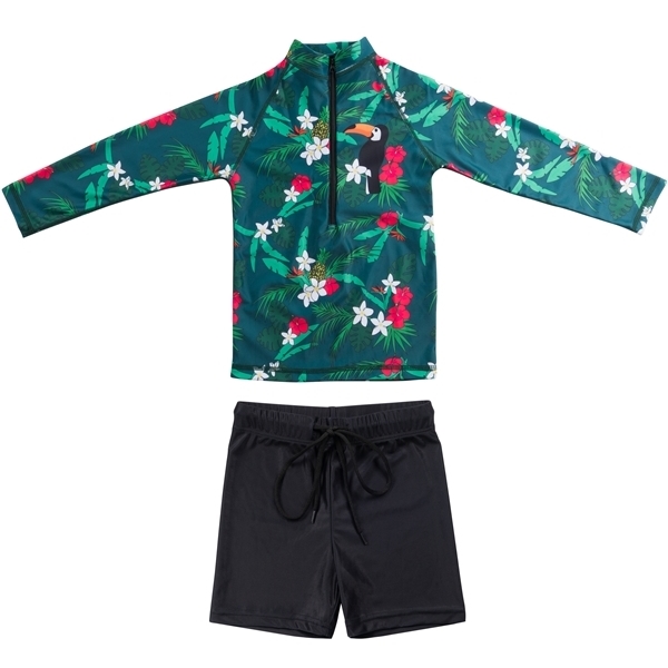 Piikaboos UV-puvut koostuvat kestävistä, elastitista materiaaleista, jotka suojaavat lasta vaarallisilta auringonsäteiltä (Aurinkosuoja UPF +50). Puku on 2-osainen ja siinä on kuvioitu yläosa ja mustat housut.
