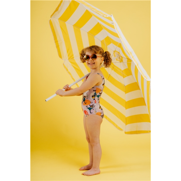 Violetti uimapuku, jossa on värikäs Peppi Pitkätossu -kuviointi. Uimapuku on vuorattu edestä, korkea selkäosa ja leveät sekä tukevat olkaimet. Valmistettu joustavasta, nopeasti kuivuvasta polyesterisekoitteesta (85% polyesteri 15% elastaani).