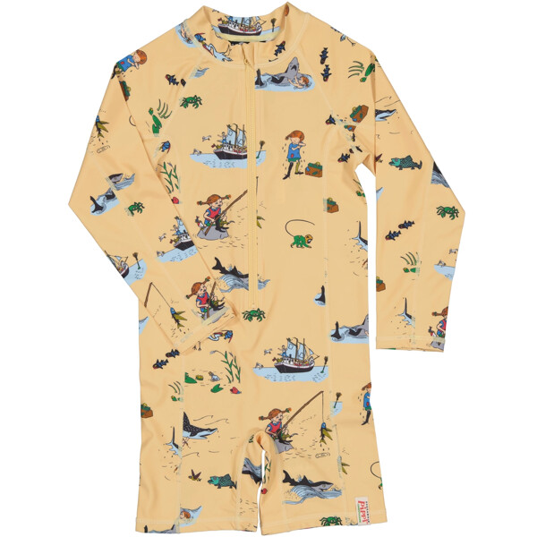 UV-asu Pippi-kuviolla Geggamojalta. Pitkät hihat ja lyhyet lahkeet, vetoketju edessä.