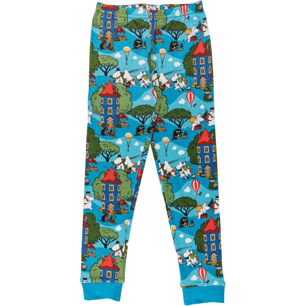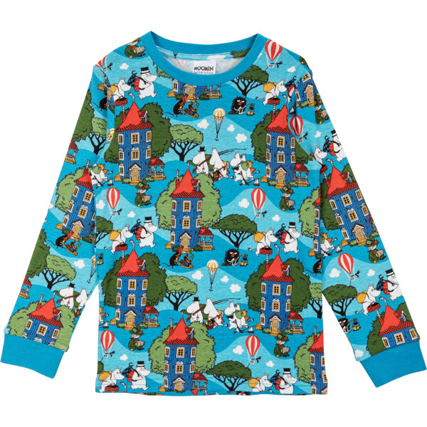 Kaksiosainen Muumi-pyjama lapsille. Pitkät hihat ja pyöreä pääntie. Housuissa on upotettu kuminauha vyötäröllä ja resori lahkeensuissa. Valmistettu pehmeästä ja mukavasta puuvillasta.