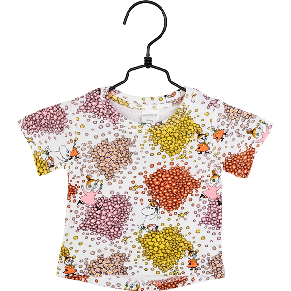Kaksiosainen, luunvalkoinen pyjama, aiheena Niiskuneiti, Pikku Myy ja Mymmeli keskellä kukkasia, väritykseltään liila-kelta-kupari. Lyhythihainen toppi kevyesti levenevänä mallina ja kauniilla, pyöristetyllä, pidemmällä takaosalla. Shortseissa on lyhyet lahkeet ja joustinnauha vyötäröllä.