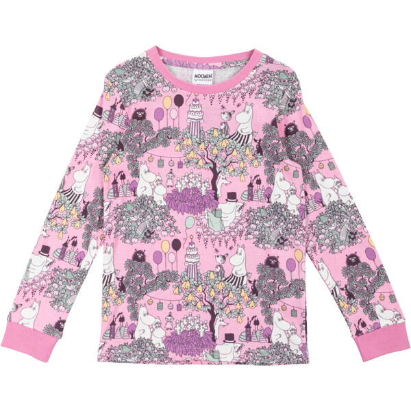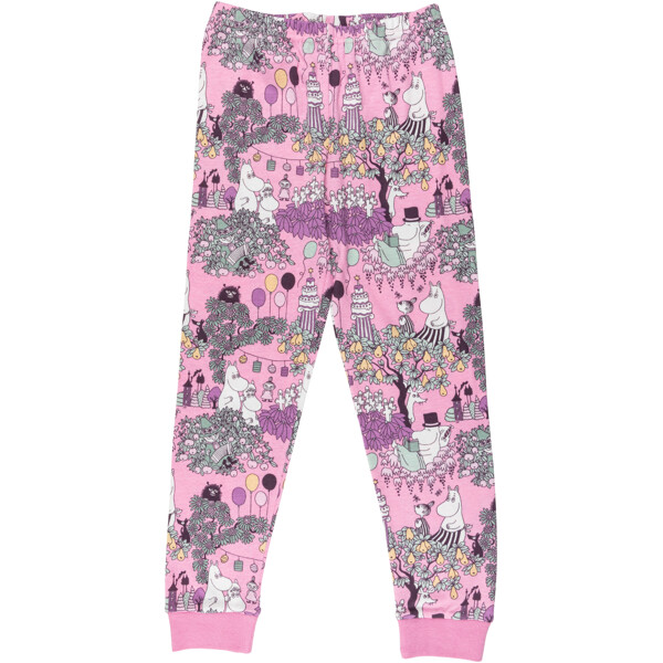 Kaksiosainen Muumi-pyjama lapsille. Pitkät hihat ja pyöreä pääntie. Housuissa on upotettu kuminauha vyötäröllä ja resori lahkeensuissa. Valmistettu pehmeästä ja mukavasta puuvillasta.