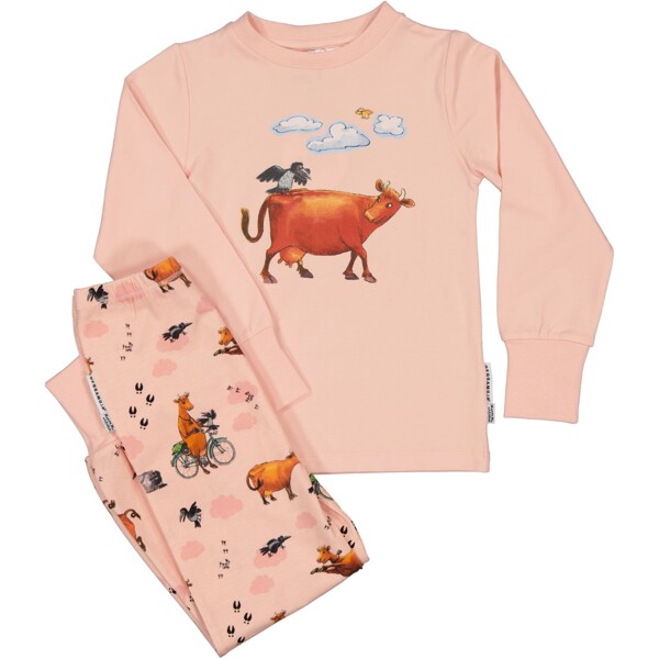 Kaksiosainen pyjama Mamma Mu -kuviolla, pehmeää ja mukavaa ekologista puuvillaa. Pyjama koostuu housuista, joissa on joustava vyötärö ja leveät resorit, sekä pitkähihaisesta paidasta, jossa on myös resorit.