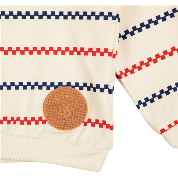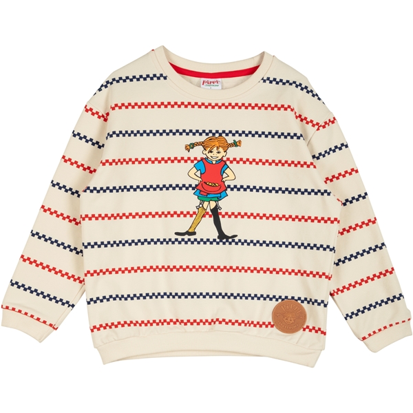 Pitkähihainen paita collegekankaasta, jossa on pehmeä, harjattu sisäpuoli ja resorit hihansuissa ja helmassa. Paita on kevyesti oversized-mallia, jossa on alaslasketut olkasaumat. Se on luunvalkoinen, ja siinä on punaisia ja sinisiä Peppi Pitkätossu-ruuturaitoja. Edessä keskellä on Peppi Pitkätossu-kumipainatus, ja helmassa on myös pyöreä Peppi Pitkätossu-merkki nahkajäljitelmää. Ekologinen puuvillasekoitus. Öko-tex.