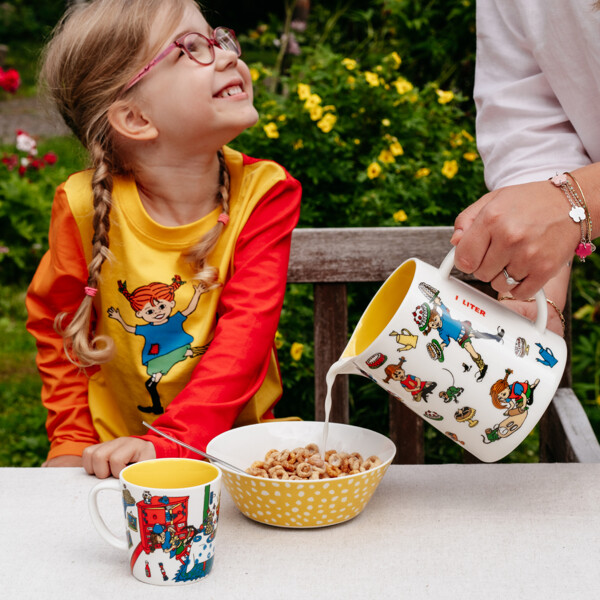 Iloinen Peppi Pusero Keltainen on värikäs ja leikkisä Peppi-pusero pitkin hihoin ja pyöreällä kaula-aukolla. Pusero on oranssin, punaisen ja keltaisen värinen ja siinä on edessä Peppi-painatus.