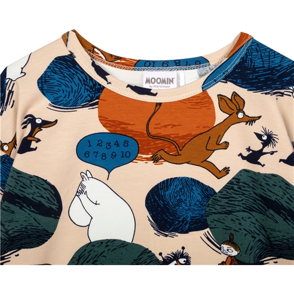 Pitkähihainen beigen värinen paita, joka on kauttaaltaan kuvitettu Muumihahmoin, jotka leikkivät piiloleikkiä ja laskevat kymmeneen kivikasojen keskellä. Malli on kevyen oversized-mallinen ja siinä on lasketut olkasaumat ja kauniisti pyöristyvä helma.