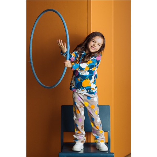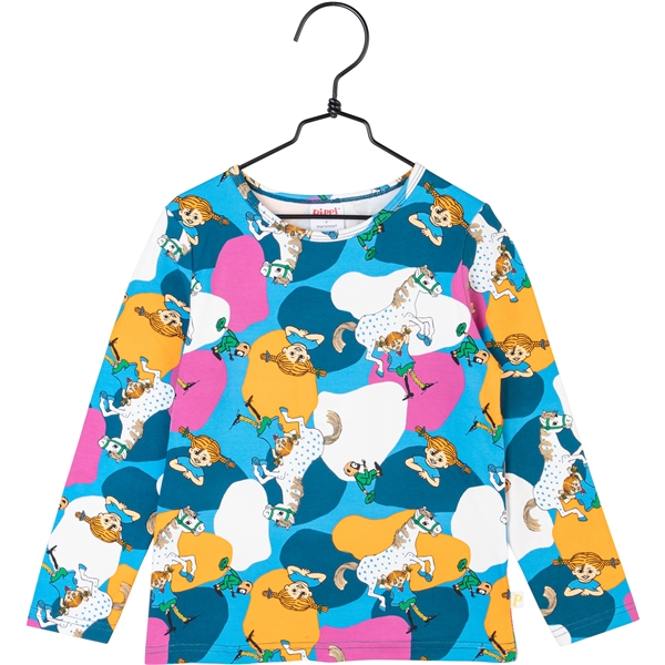 Pitkähihainen, värikäs kuviollinen trikoopaita, suora malli, aiheenaan Peppi Pitkätossu, Pikku Ukko ja Herra Tossavainen hienoin väriläiskin sinistä, oranssia, valkoista ja liilaa.