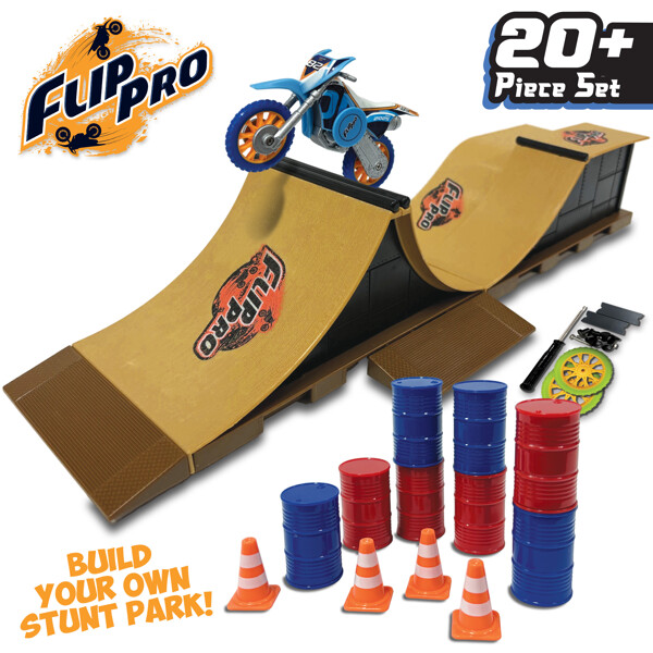 Flip Pro Spin Bike on tehty villeihin stuntteihin, siisteihin flippeihin ja nonstop-toimintaan teräskuulalaakereilla salamannopeisiin pyörähdyksiin ja tarkkaan hallintaan. Flip Pro Bike -pyörän lisäksi tämä Stunt Park -setti sisältää vaihdettavat pyörät, 2 ramppia, 8 tynnyriä ja 4 kartiota, joten sinulla on kaikki mitä tarvitset oman stunttiradan rakentamiseen ja leikin viemiseen seuraavalle tasolle.