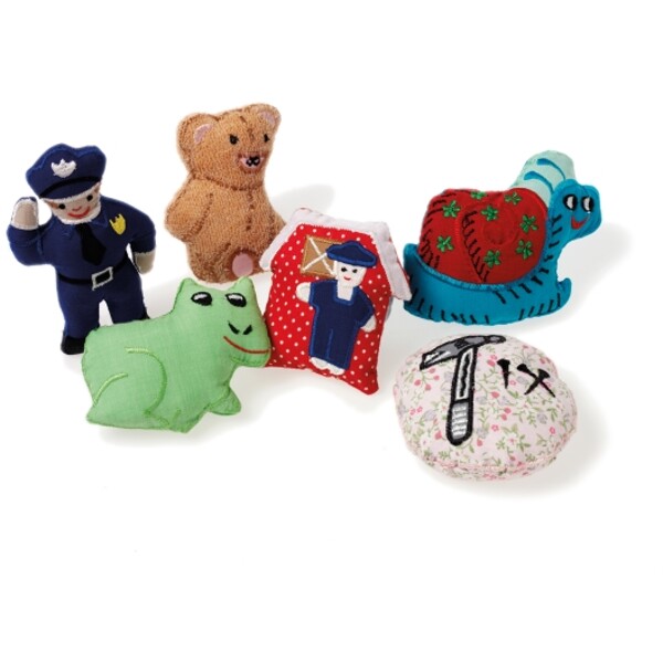 Oskar & Ellenin pussissa 2 on etana, poliisi, nalle, maatila, vasara ja naula sekä sammakko.