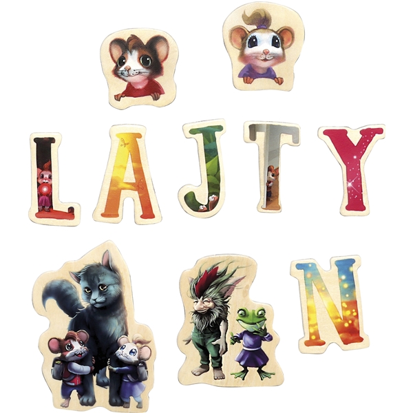 Setti sisältää 55 kirjainta pohjoismaisista ja saksalaisista aakkosista sekä 17 hahmoa.