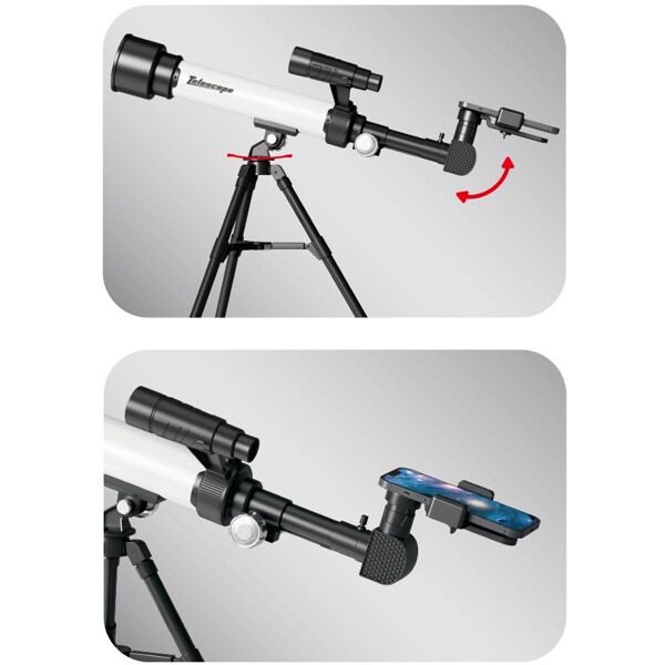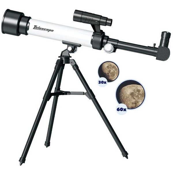 Siisti kaukoputki jalustalla, matkapuhelimen pidikkeellä ja vaihdettavilla okulaareilla, joissa on 30x ja 60x suurennus.