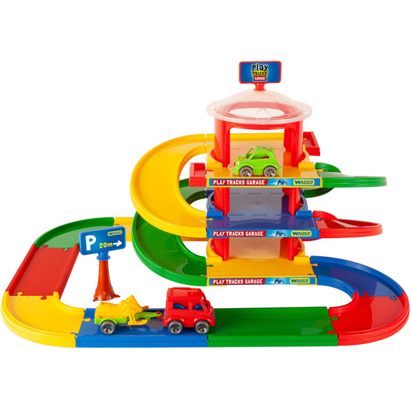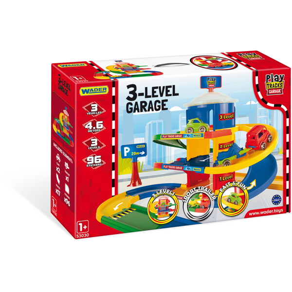 Leikkisetti sisältää kolme iloista ajoneuvoa – pakettiauton perävaunulla, moottorikelkan ja auton – sekä 4,6 m tietä, 48 tarraa ja tarvikkeita.