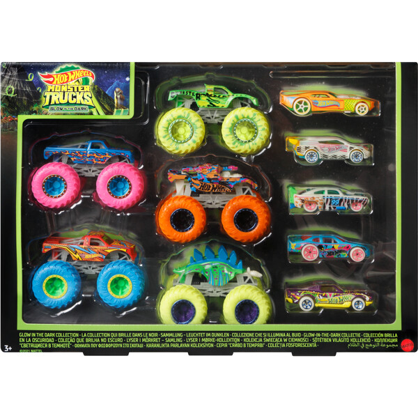 Lahjapakkaus täynnä pimeässä hohtavia monsteriautoja ja Hot Wheels -autoja!