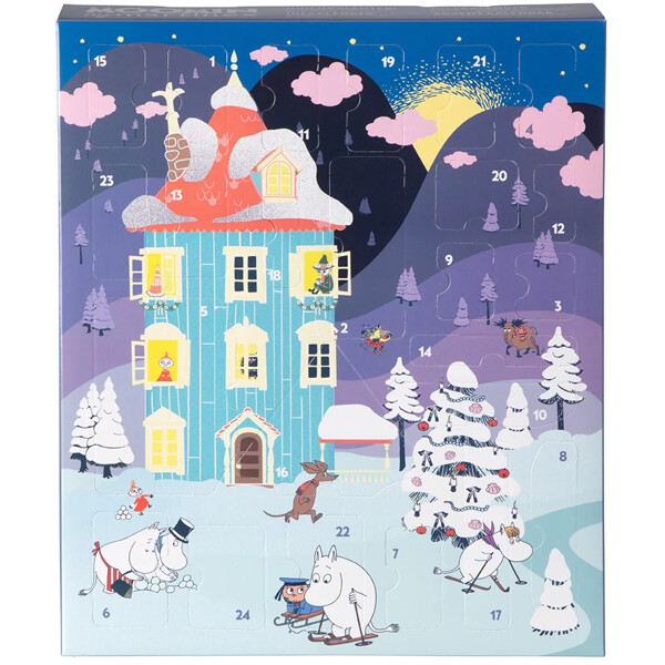 24 jännittävän luukun takana piilee 17 leikkihahmoa, joista kaksi on aivan uusia. Lisäksi luukut paljastavat osat koottavaan pahviseen Muumitaloon sekä tarroja ja värikyniä talon koristeluun.