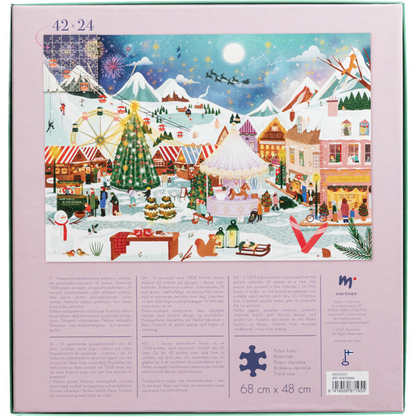 Palapelin palat on numeroitu takapuolelta ja pakattu joulukalenterin 24 pieneen laatikkoon, jotta sopivan kokoinen osa palapelistä kasvaa esiin joka päivä. Jouluaattona voi nauttia koko 1008 palan palapelistä, kun viimeiset palat on asetettu paikoilleen ja kaunis talvinen kuva joulumarkkinoista, karusellista ja ilotulituksesta on valmis.