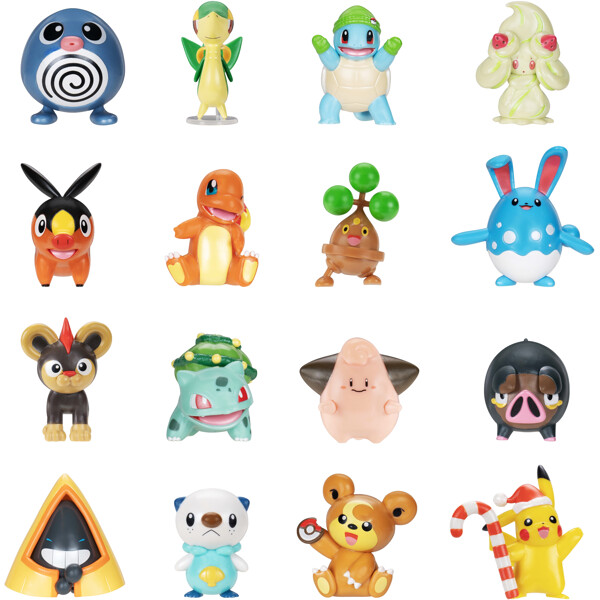 Juhlista juhlakauden Pokémon Holiday Calendarin kanssa. Tämä 24 päivän kalenteri sisältää 16 taisteluhahmoa ja kahdeksan lisävarustetta, tarjoten jouluteemaisen Pokémon-lahjan jokaiselle päivälle. Kaikilla taisteluhahmoilla on erityinen viimeistely. Leiki uudella hahmolla tai lisävarusteella joka päivä ja esittele koko setti vuoden lopussa.