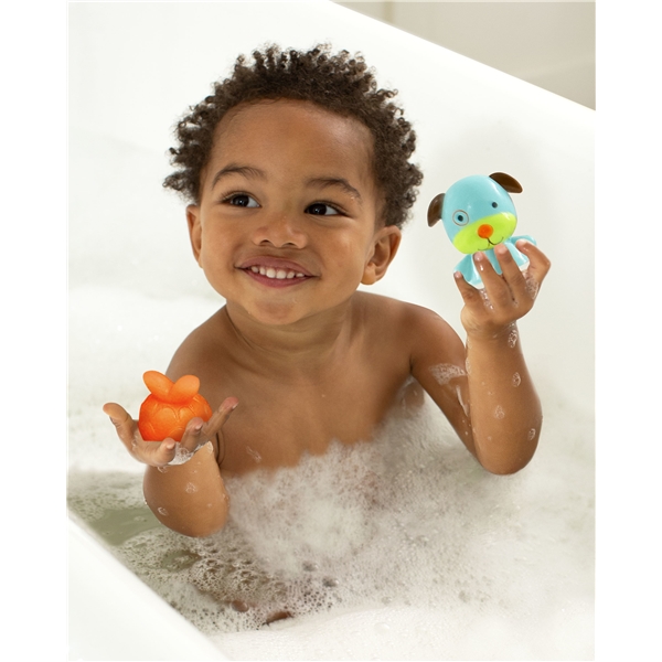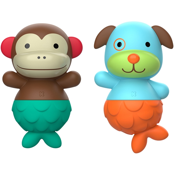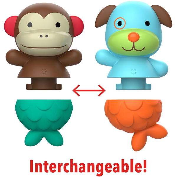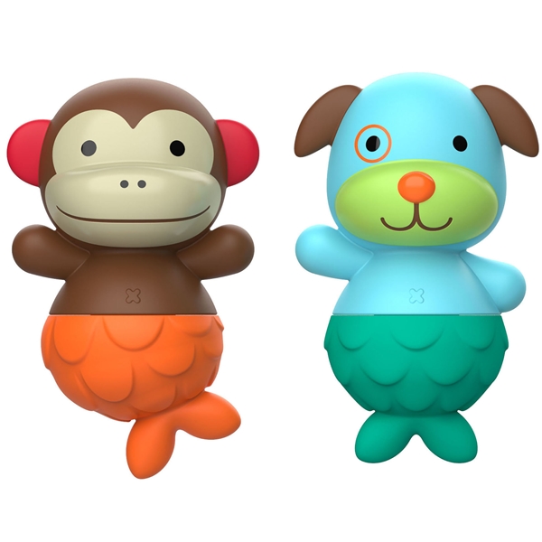 Skip Hop Zoo Merenneito Apina & Koira tekevät kylpyhetkistä hauskempia. Merenneidon pyrstön voi irroittaa ja siihen voi kiinnittää jonkin mukanatulevista eläinvartaloista. Kaikki osat kelluvat ja ne ovat sopivan kokoisia lapsen käsille. Kehittää lapsen silmä-käsi-koordinaatiota.
