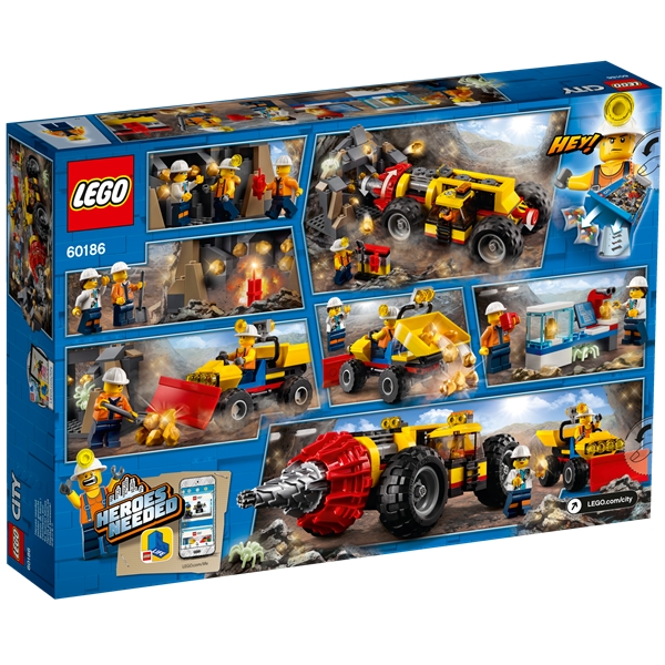 60186 LEGO City Kaivoksen tehopora - Kaivaa kultaa ja tee sille testejä! Aja jykevä pora syvälle luolaan ja vedä kultahiput ulos kauhakuormaajalla. Tyhjennä kauha laboratorion viereen, jotta geologit voivat analysoida, mitä olet löytänyt. Pidä tauko ja puhdista pora telineen työkaluilla tai aiheuta lisää sotkua! Varo valtavaa hämähäkkiä, joka istuu kivien päällä. Se ei näytä kovin ilahtuneelta, kun meluisa työ häiritsi sen rauhaa! Sisältää 3 pienoishahmoa ja itsestäänloistavan hämähäkin.
