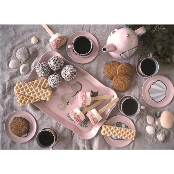 JaBaDaBaDo Teesetti Merihevonen on suloinen meriaiheinen, peltinen teesetti. Astiasto on vaaleanpunainen ja simpukoin ja pilkuin koristeltu, siinä on suloinen merihevosen kuva ja se toimitetaan pahvisessa siihen sopivassa laukussa. Kata astiasto ja kutsu teekutsuille ystävät, perhe tai nallet. Teeastiasto sisältää 15 osaa ja se on pakattu hienoon pahvilaukkuun.