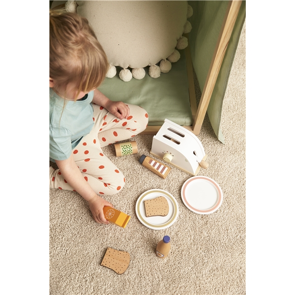 Setti, joka sisältää erilaisia pulloja ja purkkeja FSC-sertifioidusta puusta. Hieno lisä lapsille, jotka rakastavat ruoanlaittoa tai kaupassa käyntiä. Siihen kuuluu appelsiinimehu, hernepurkki, vahva kastike, mikä-tahansa-kastike ja ketsuppi.