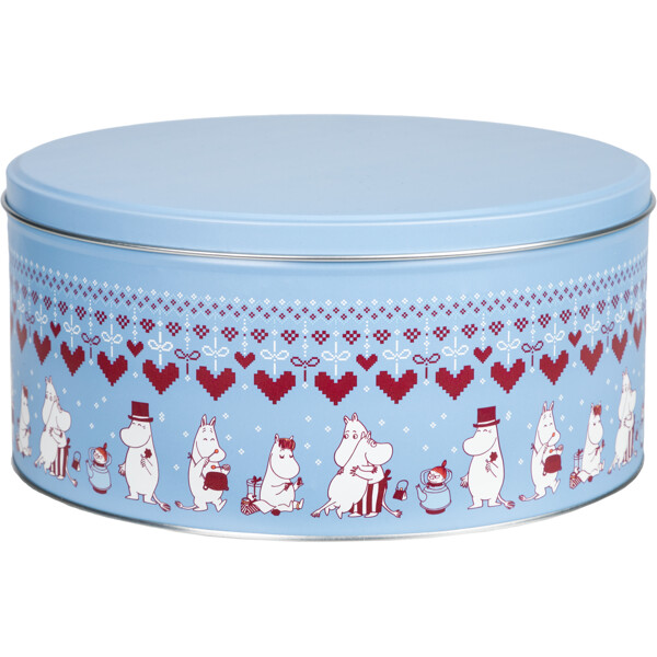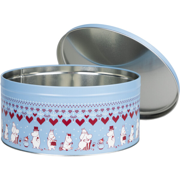 Suuri pyöreä peltipurkki, täydellinen esimerkiksi kekseille tai piparkakuille. Purkin ulkopuoli on kauniin sininen sävy ja siinä on talvinen Muumi-aihe.