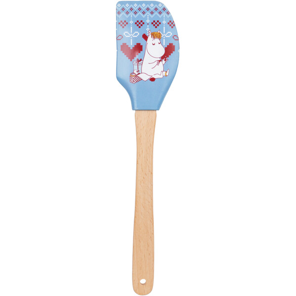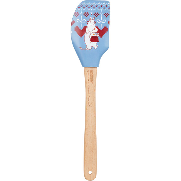 Puuvarrella varustettu nuolija, jota koristaa juhlava Muumi-aihe talvitunnelmalla.