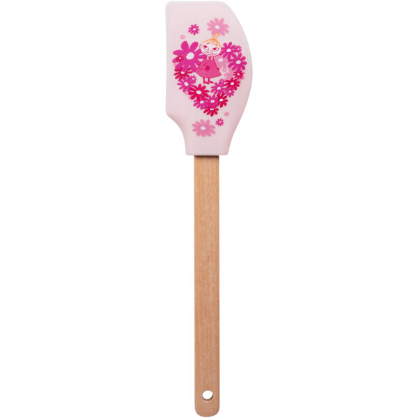Muumi nuolija ja sydämenmuotoinen piparkakkumuotti. Silikoninuolijassa, jossa on puuvarsi, on kaunis vaaleanpunainen väri ja muumiaihe vaaleanpunaisilla kukilla, jotka muodostavat sydämen.