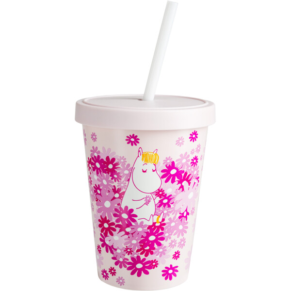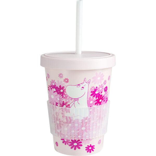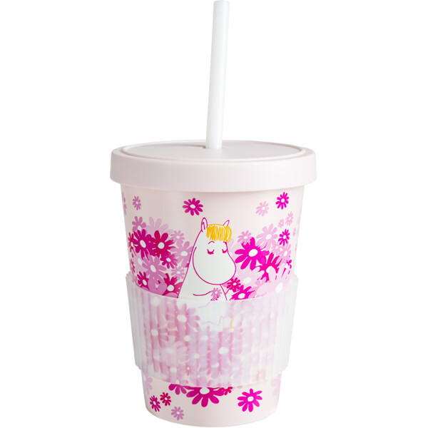 Suloinen, vaaleanpunainen pillimuki kannella, valmistettu kierrätetystä muovista, rakastettavalla Muumi-aiheella.