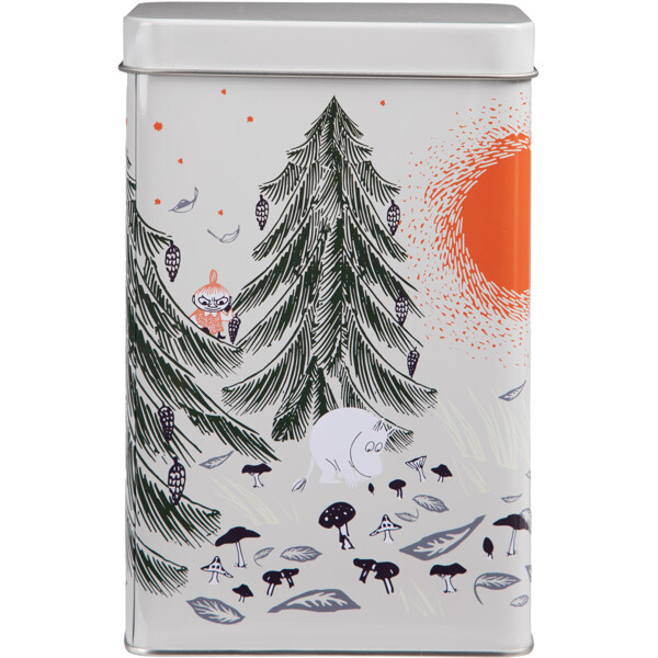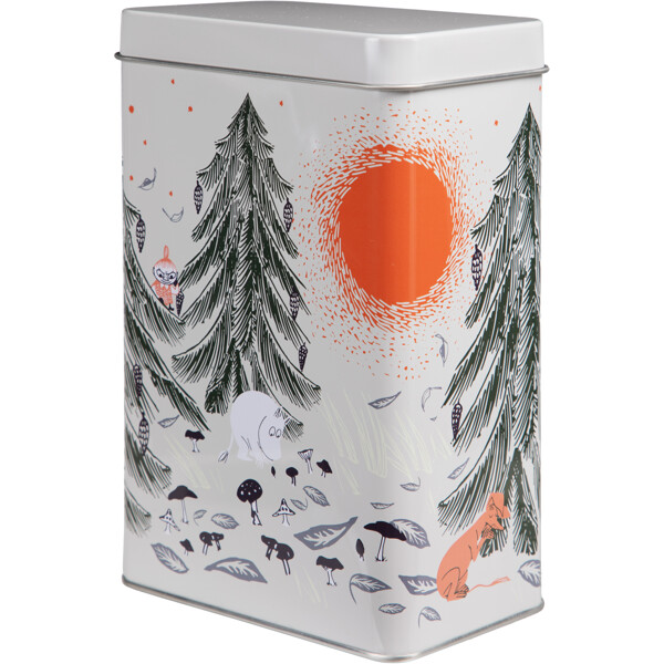Kaunis peltinen kahvipurkki, jossa Muumipeikko ja hänen ystävänsä viettävät unohtumatonta syyspäivää metsässä, jossa sekä keho että sielu saavat levätä.