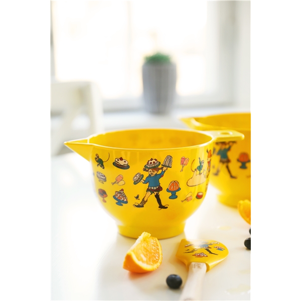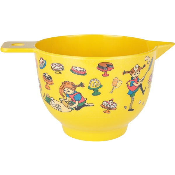 Peppi Pitkätossu Leipoo Leivontakulho 1,5 L on upea kirkkaankeltainen melamiininen leivontakulho, joka kuuluu uuteen Peppi Pitkätossu leipoo -leivontasarjaan. Leivontakulhossa on upeita Peppi-kuvia. Kulhossa on kumirengas pohjassa, joka antaa hyvän pidon ja siinä on kätevä kaatonokka ja aukko ripustamista varten.