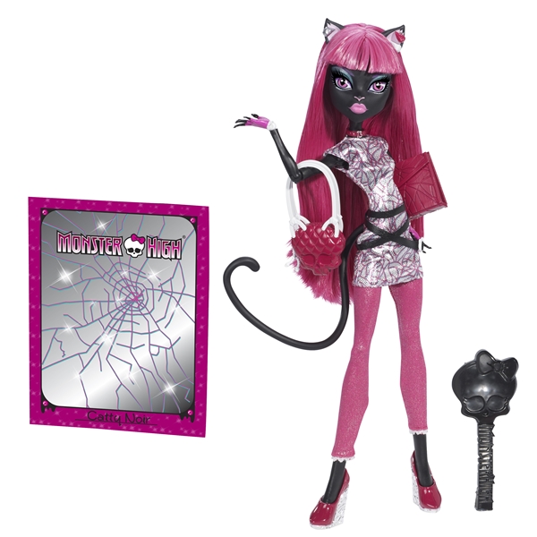 Monster High Scaremaster - Catty Noir on pelottavan hieno nukke suositulta Monster Highlta. usi lukukausi Monster Highssa tarkoittaa uusia kavereita, uusia läksyjä ja uusia kuolemanhienoja tyylejä. Catty Noirilla on coolit kouluvaatteet pelottavin yksityiskohdin ja tarvikkeet jotka sopivat hänen hirviöpersoonallisuuteensa. Erikoinen koululaukku, kansio, harja, alusta ja päiväkirja kuuluvat settiin.