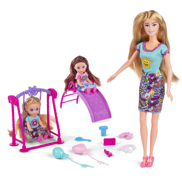 Setti sisältää 3 nukkea, keinun, liukumäen ja tarvikkeita.